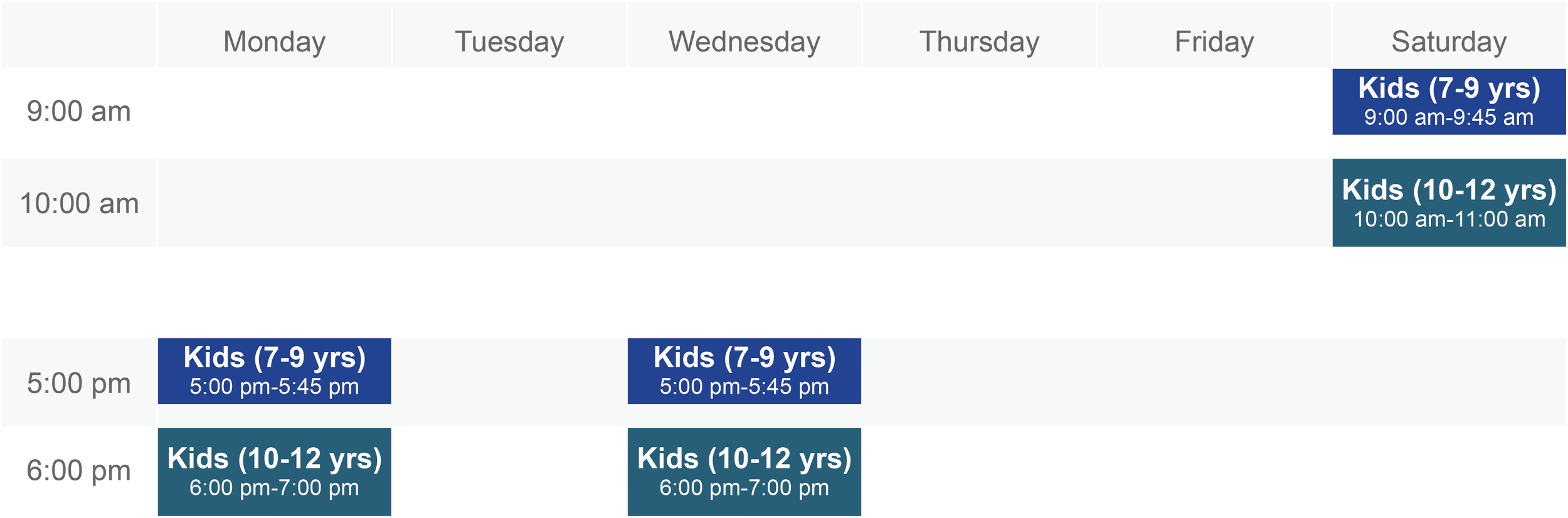 7-9 years old | Mondays and Wednesdays 5:00pm - 5:45pm, Saturdays 9:00am - 9:45am